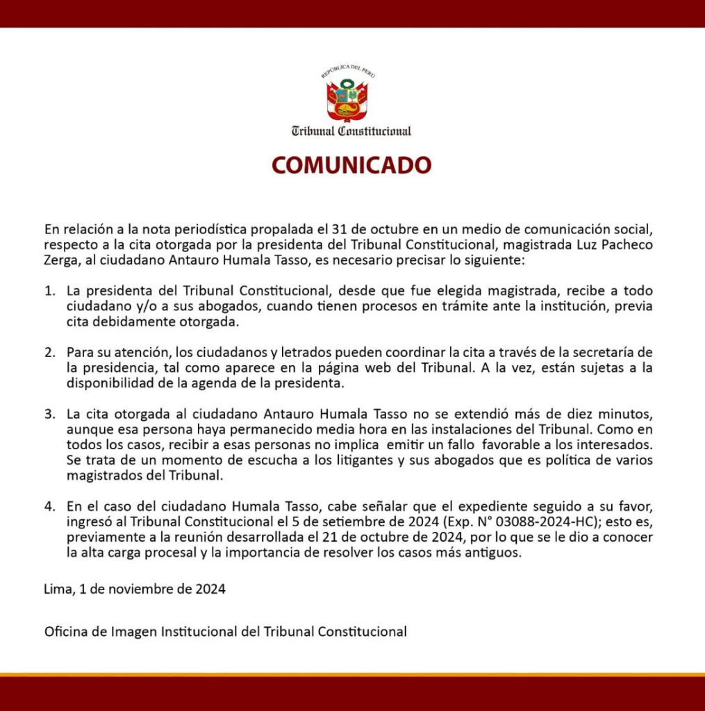 El Tribunal Constitucional, a través de un comunicado, confirmó la reunión del pasado 21 de octubre entre su presidenta, Luz Pacheco, con el líder del partido A.N.T.A.U.R.O. y sentenciado por el asesinato de cuatro policías, Antauro Humala.
